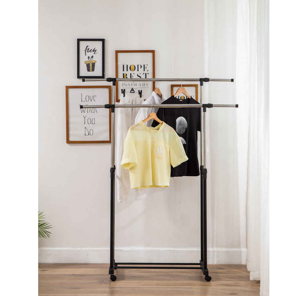 ✅ Verrijdbaar mobiel Dubbel Kledingrek op wieltjes met 2 Uitschuifbare Kledingstangen van 90 -> 150 Cm. En in hoogte verstelbaar van 100 -> 160 Cm. Praktisch, stevig en mooi.