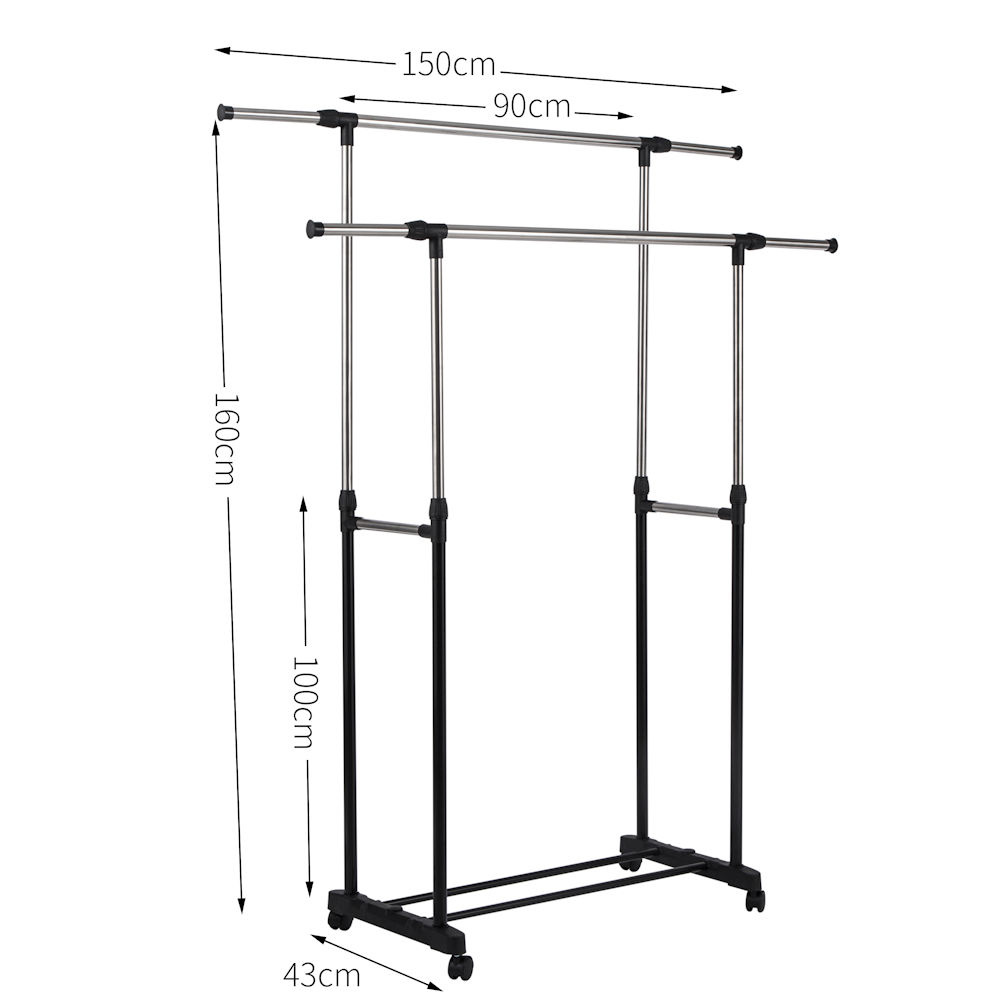 De stangen van dit mobiele kledingrek met 2 ophangstangen zijn eenvoudig in zowel hoogte als Lengte aan te passen naar uw eigen wensen. In hoogte verstelbaar van 100 naar max. 160 Cm. En in de Lengte verstelbaar van: 90 naar ma. 150 Cm.