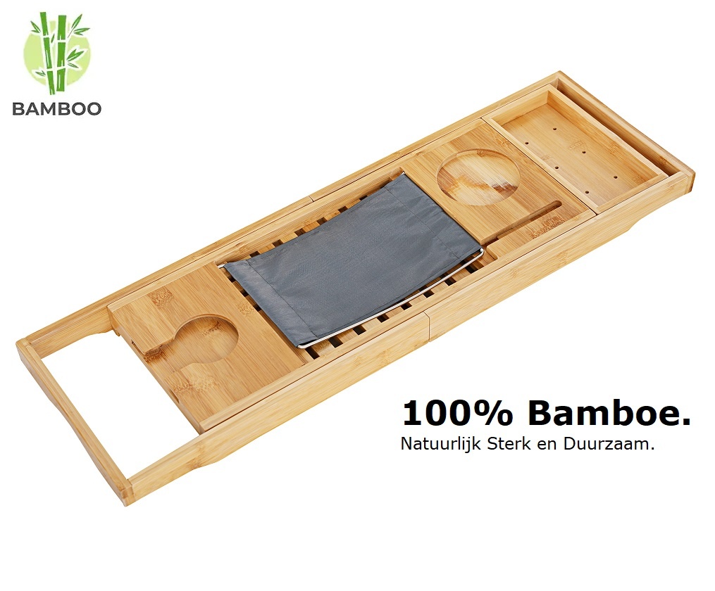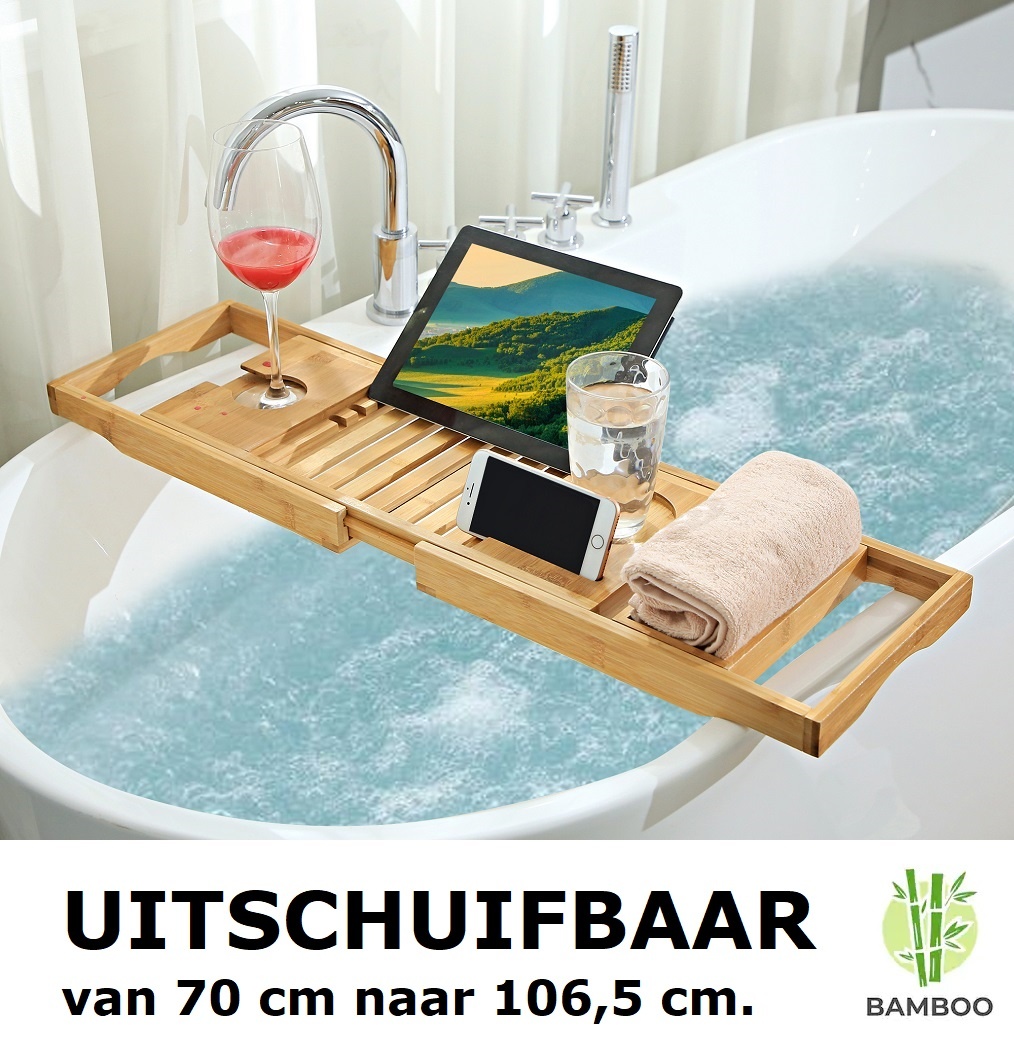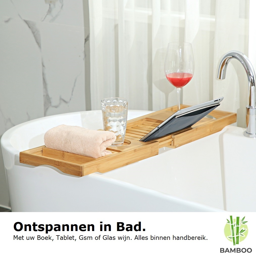 Heerlijk ontspannen in bad wordt nog lekkerder met dit mooie verstelbare bamboe badrekje. Voor o.a Telefoon, Tablet, Boek en Wijn.