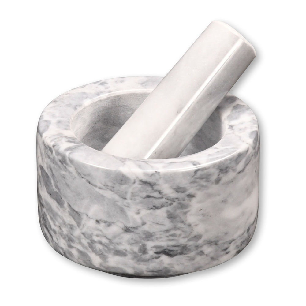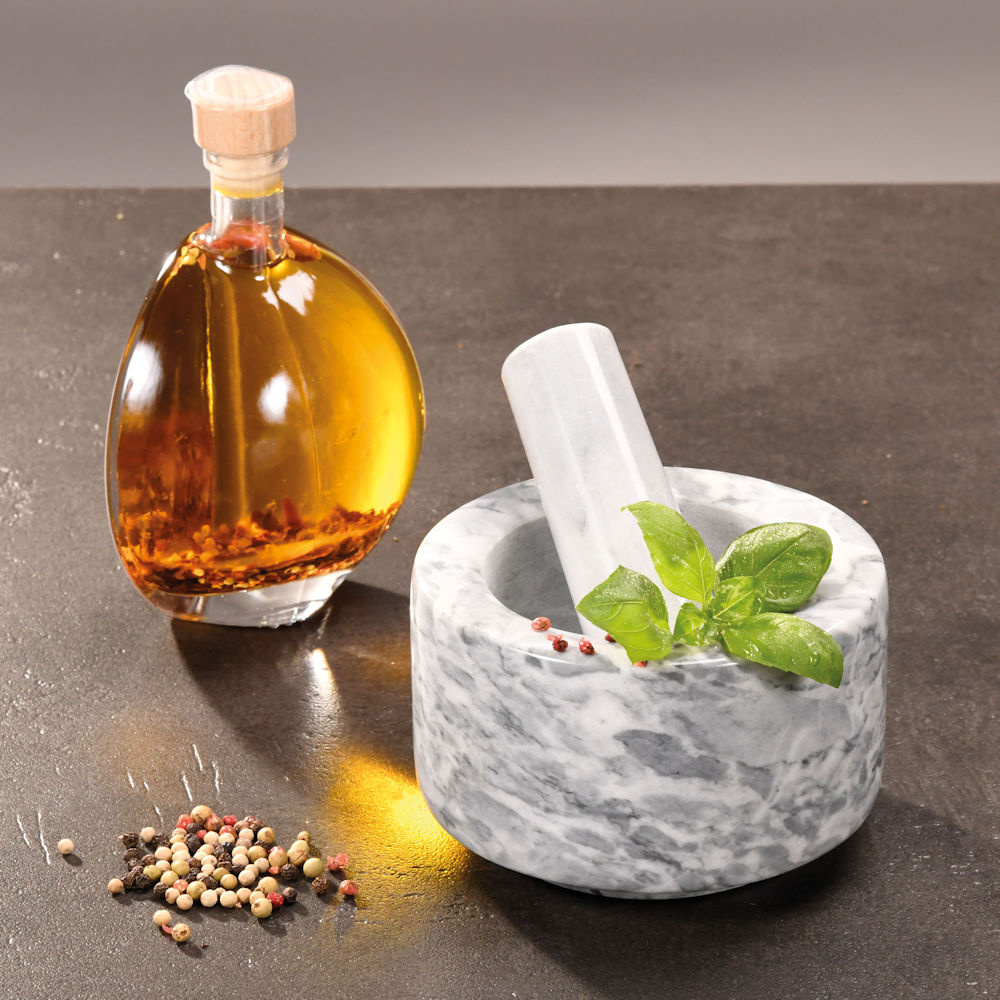 Vijzel met stamper van echt Wit Marmer, zware basis voor optimale stabiliteit voor de volledige ontwikkeling van natuurlijke aroma's.
