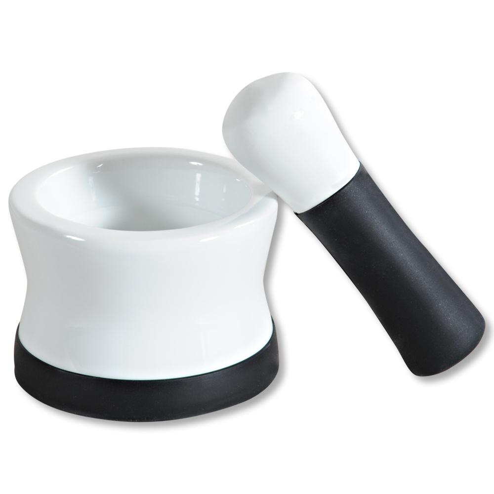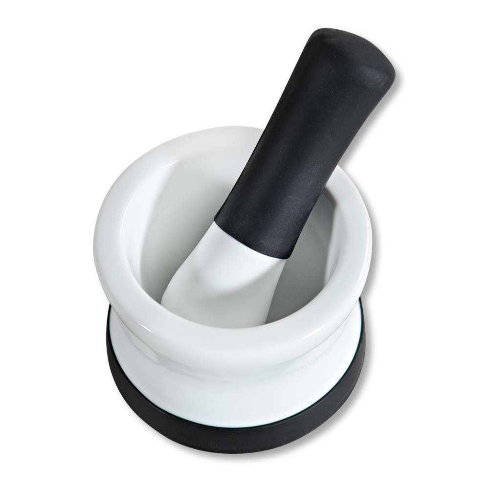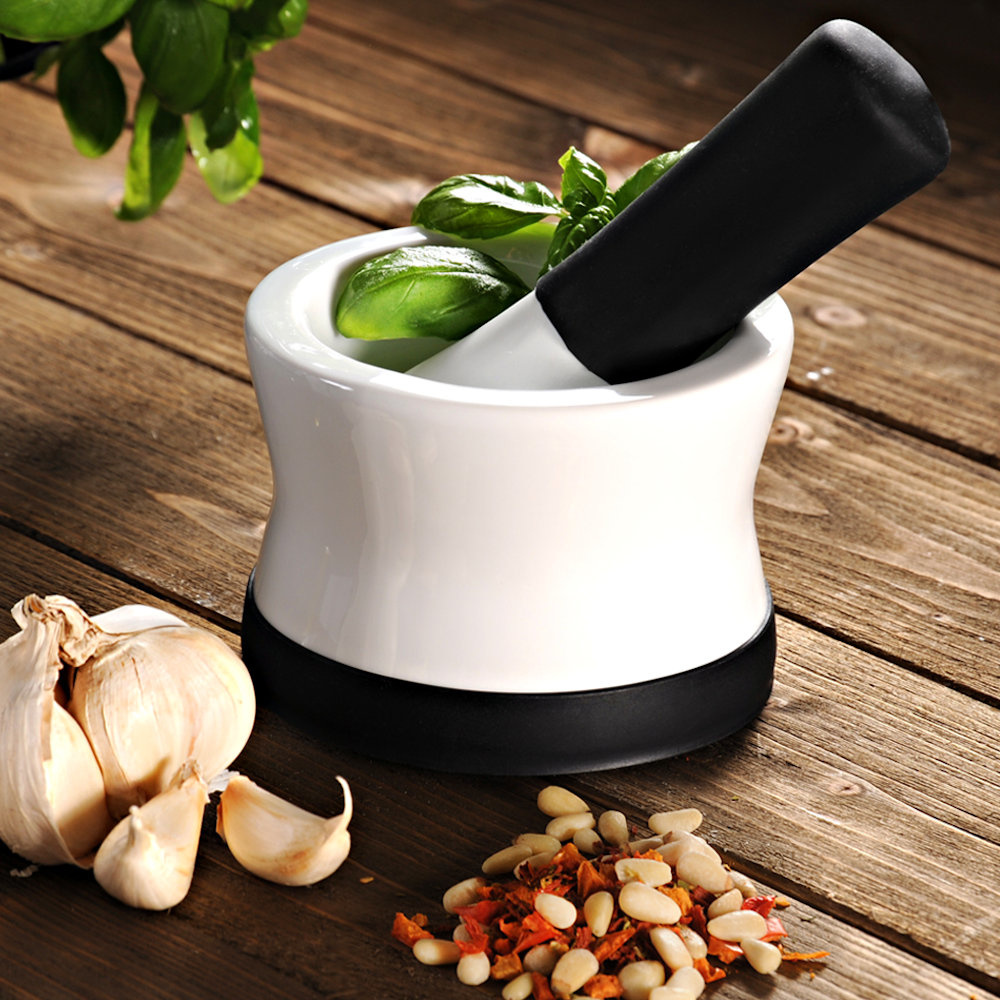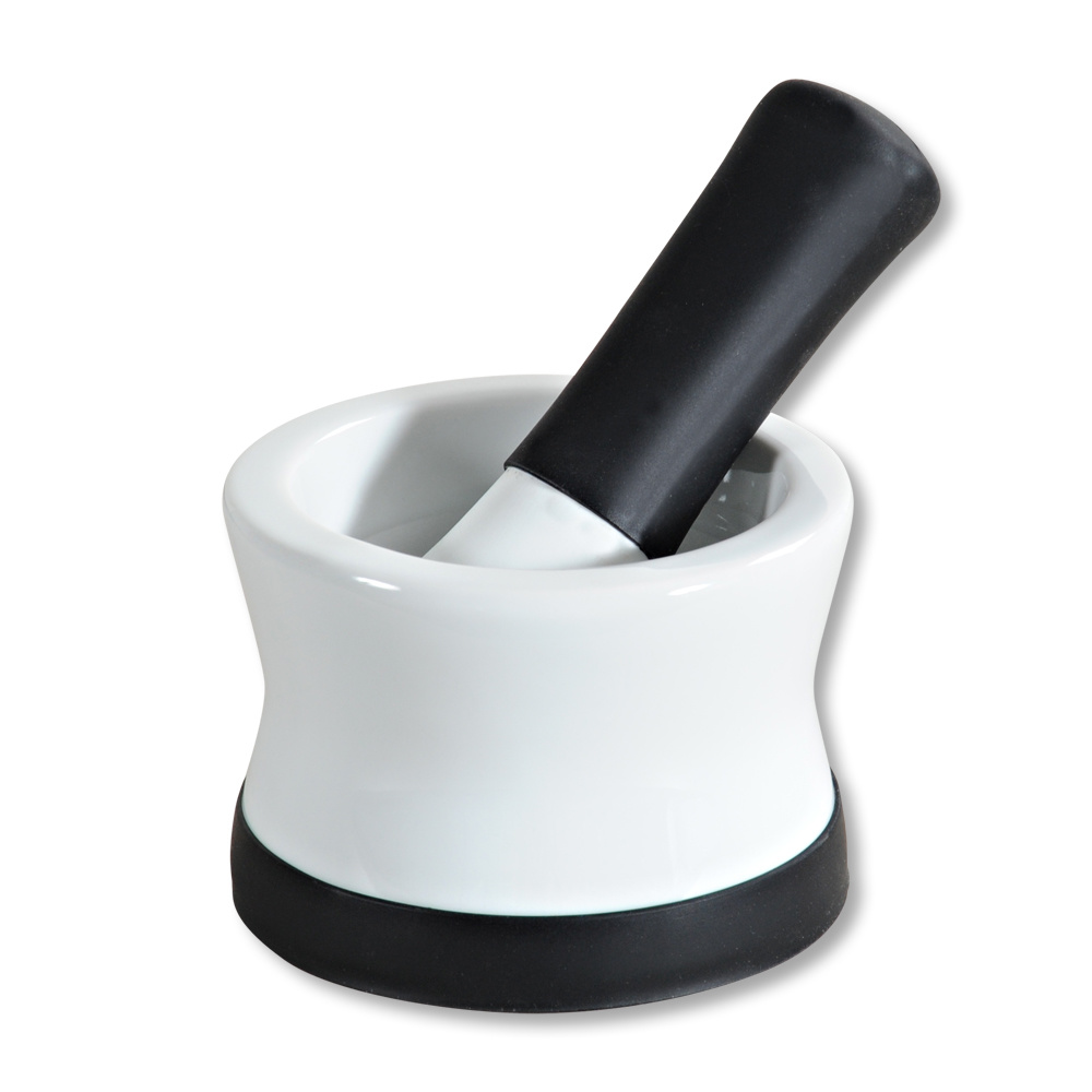 Een erg fijne vijzel met stamper, als je van vers eten houdt. Dankzij het harde porselein is het fijn malen of stampen van al je ingrediënten zeer eenvoudig geworden. Alle geuren en smaken komen optimaal vrij, tijdens het stampen. De vijzel heeft een ruwe binnenkant en is van de buitenzijde gepolijst. En is uitgevoerd in de kleur wit met een zwarte streep.