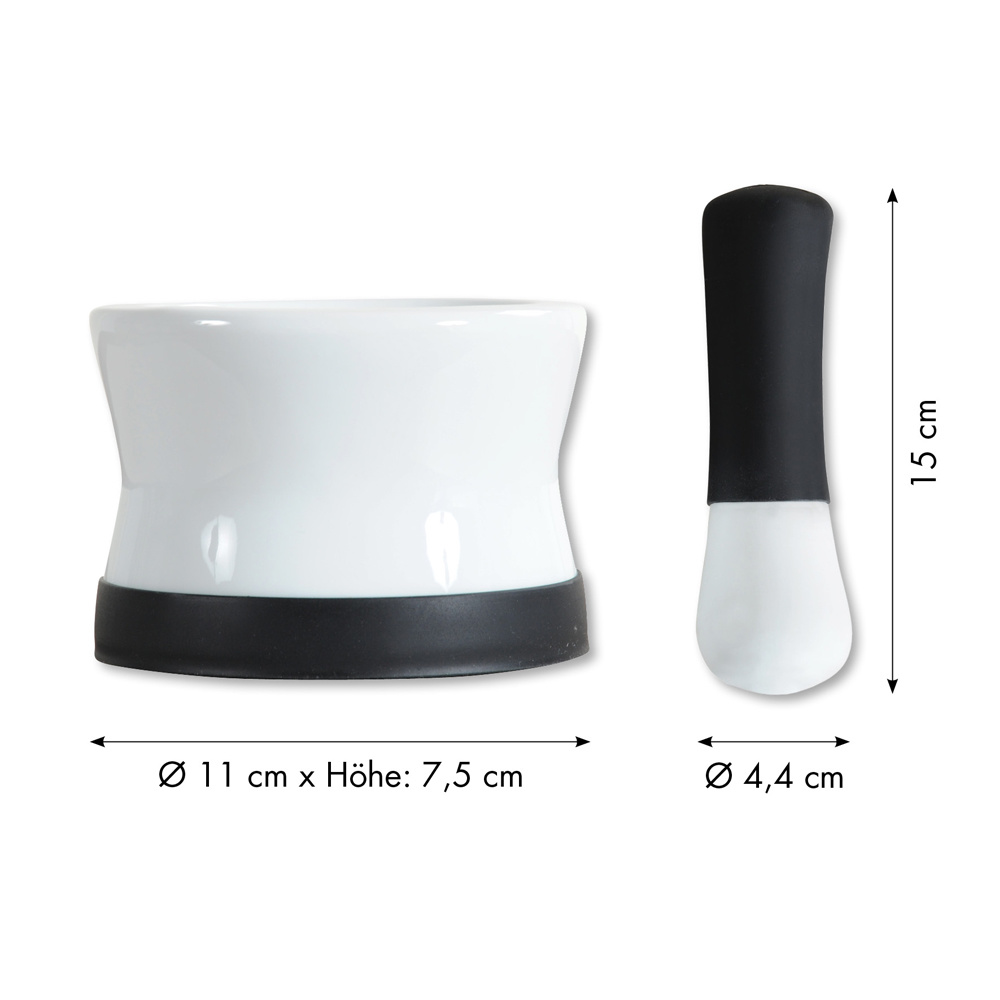Deze vijzel heeft een diameter van 11 cm en staat hierdoor stevig op het aanrecht. Wordt geleverd met bijpassende stamper. Materiaal: Porselein.