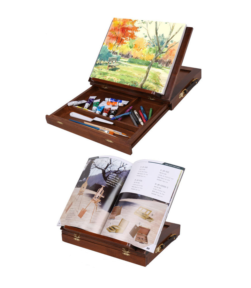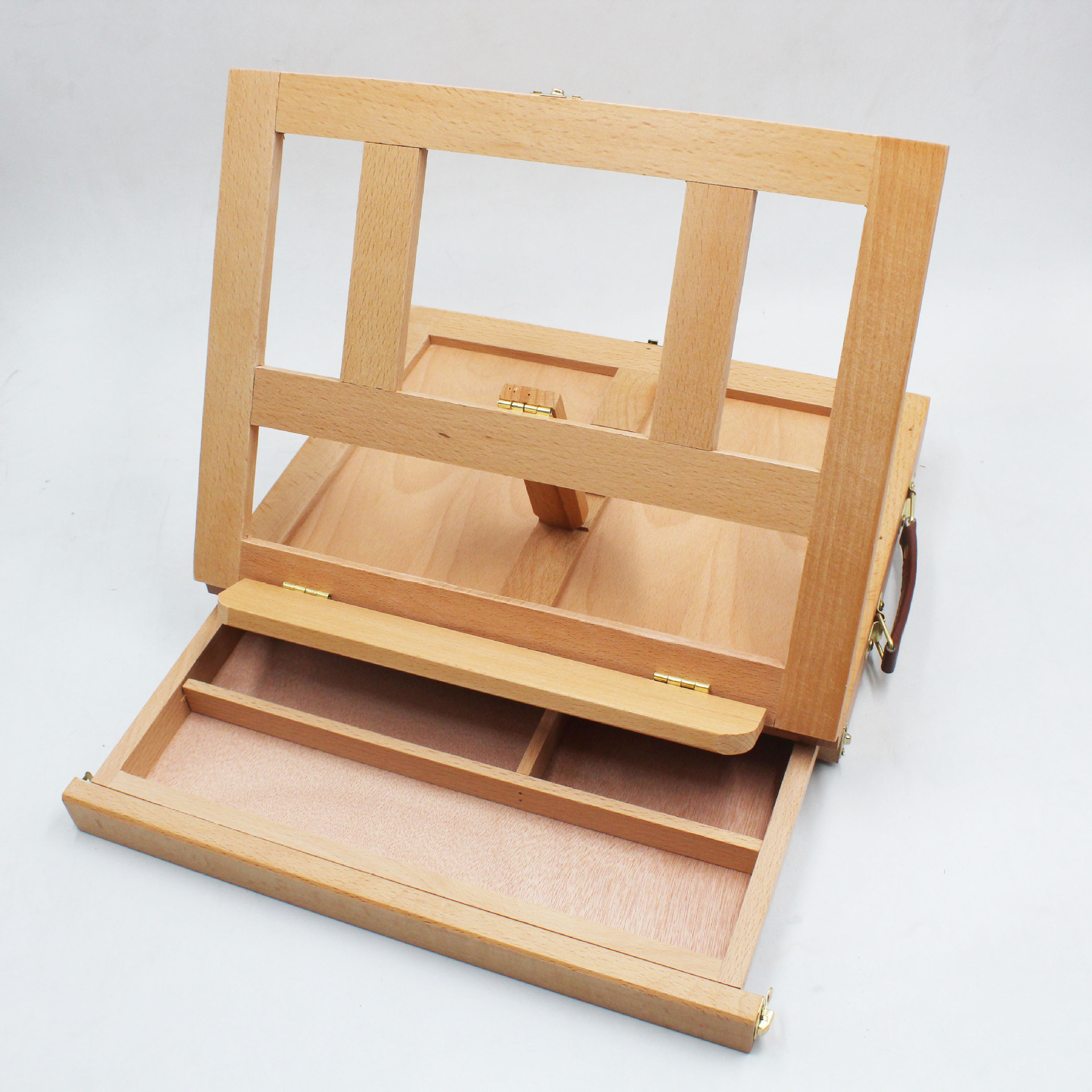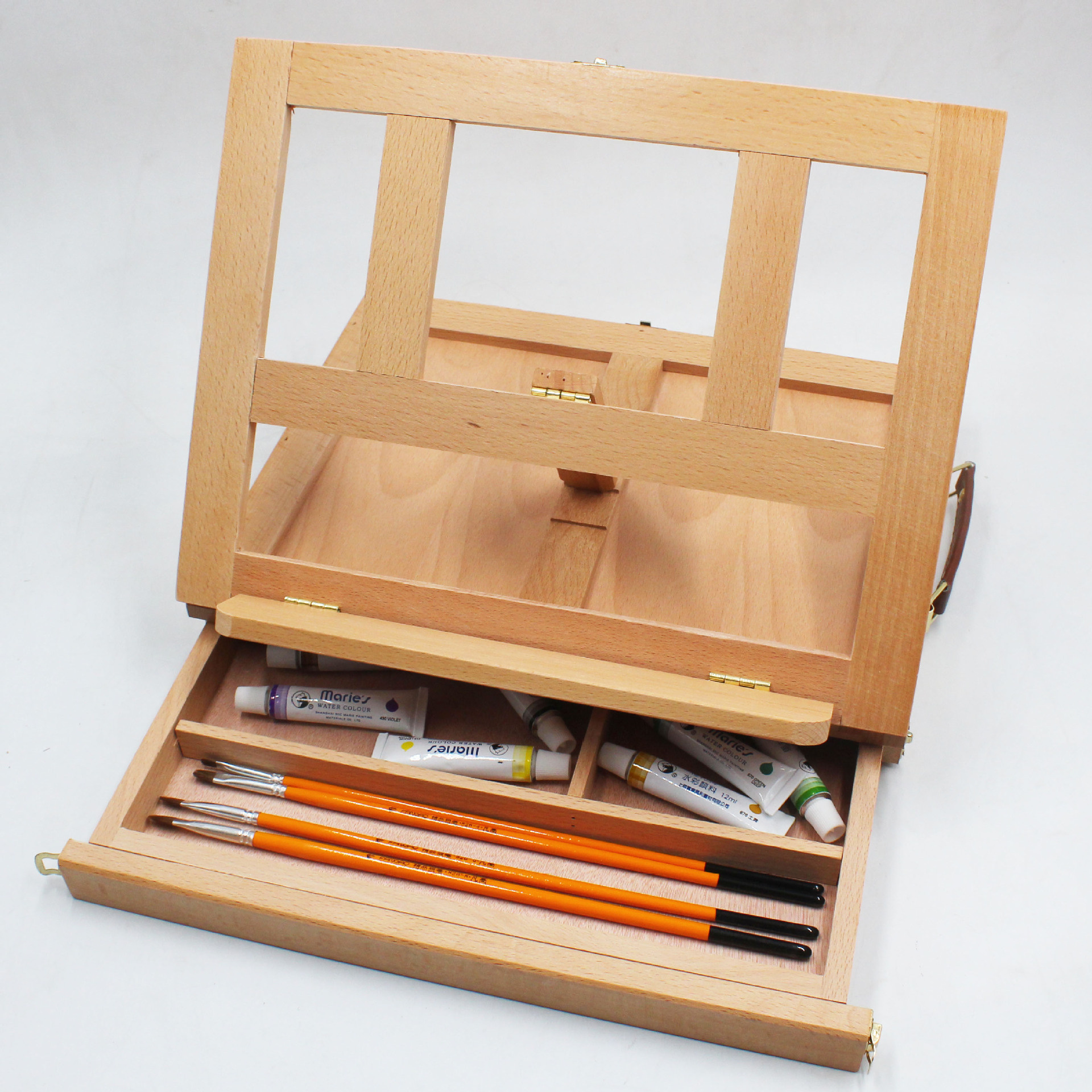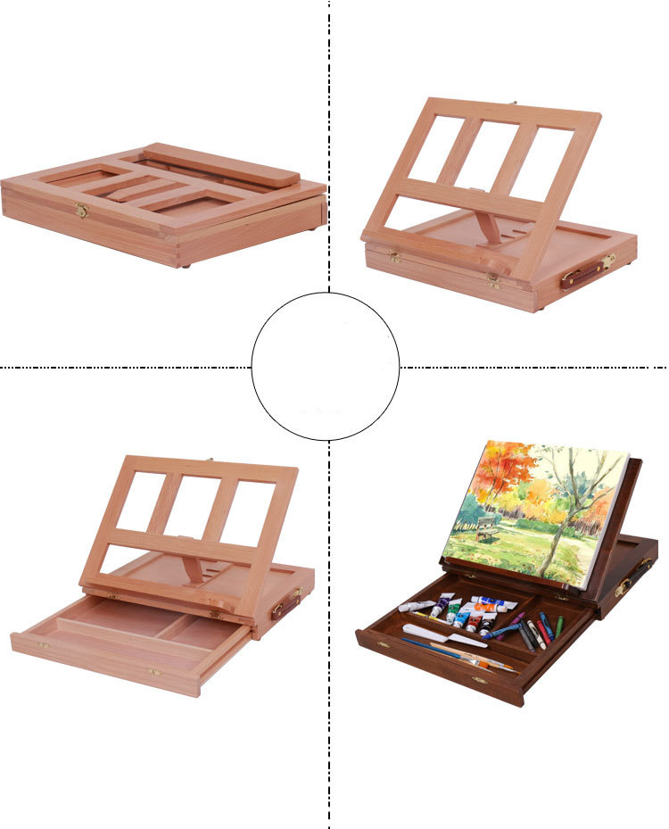 Dit is een zeer compacte tafel schildersezel. Daarom kan je deze schildersezel vrijwel overal neerzetten zonder dat hij in de weg staat. Ondanks dat hij compact is, heeft hij 1 schuiflade met 3 vakjes en daarmee biedt hij meer dan voldoende ruimte, om uw verf penselen in op te bergen.