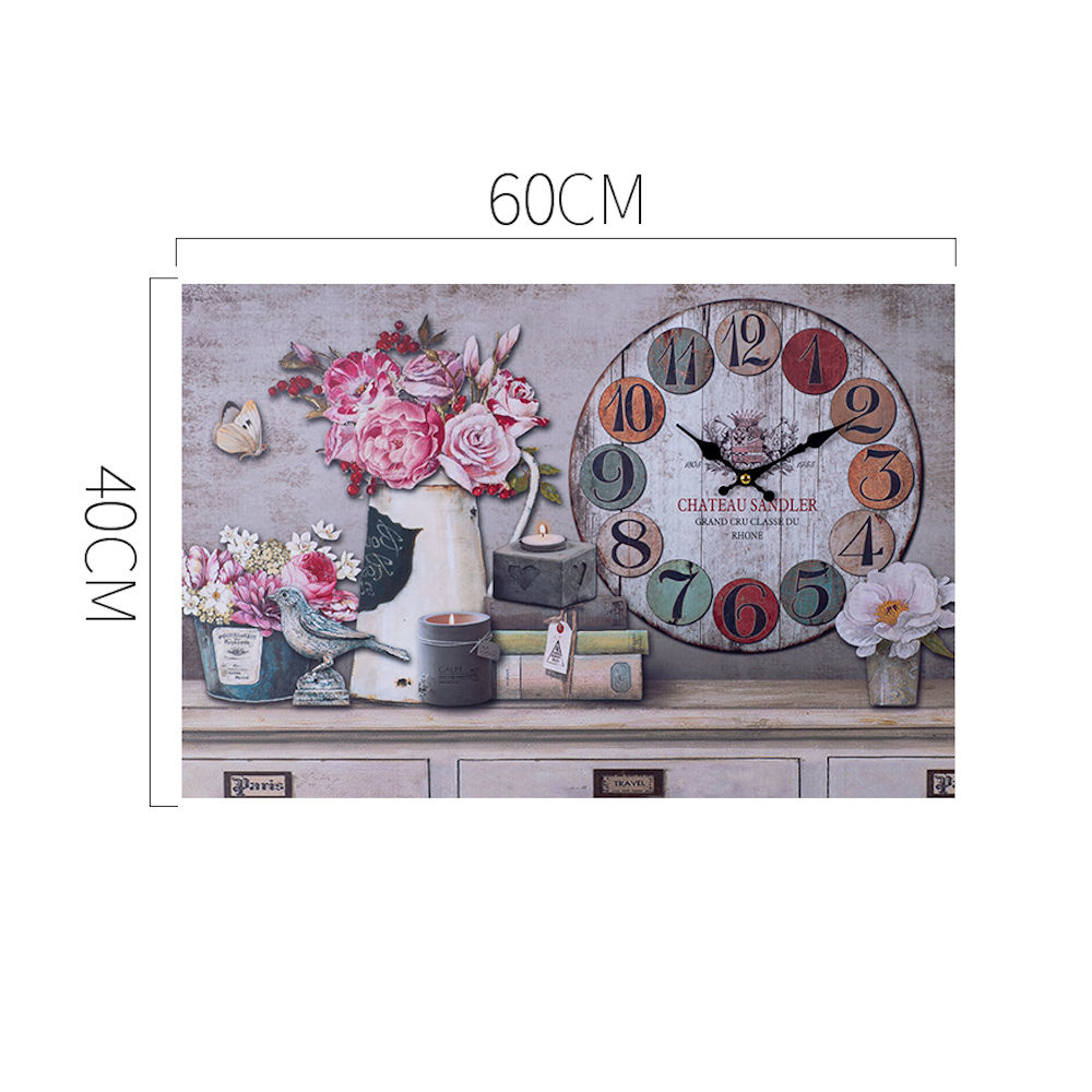 Deze grote canvas schilderij wandklok is rechthoekig, 60 x 40 Cm. En heeft een analoge tijds weergave, doormiddel van de prachtige cijfers op de print.