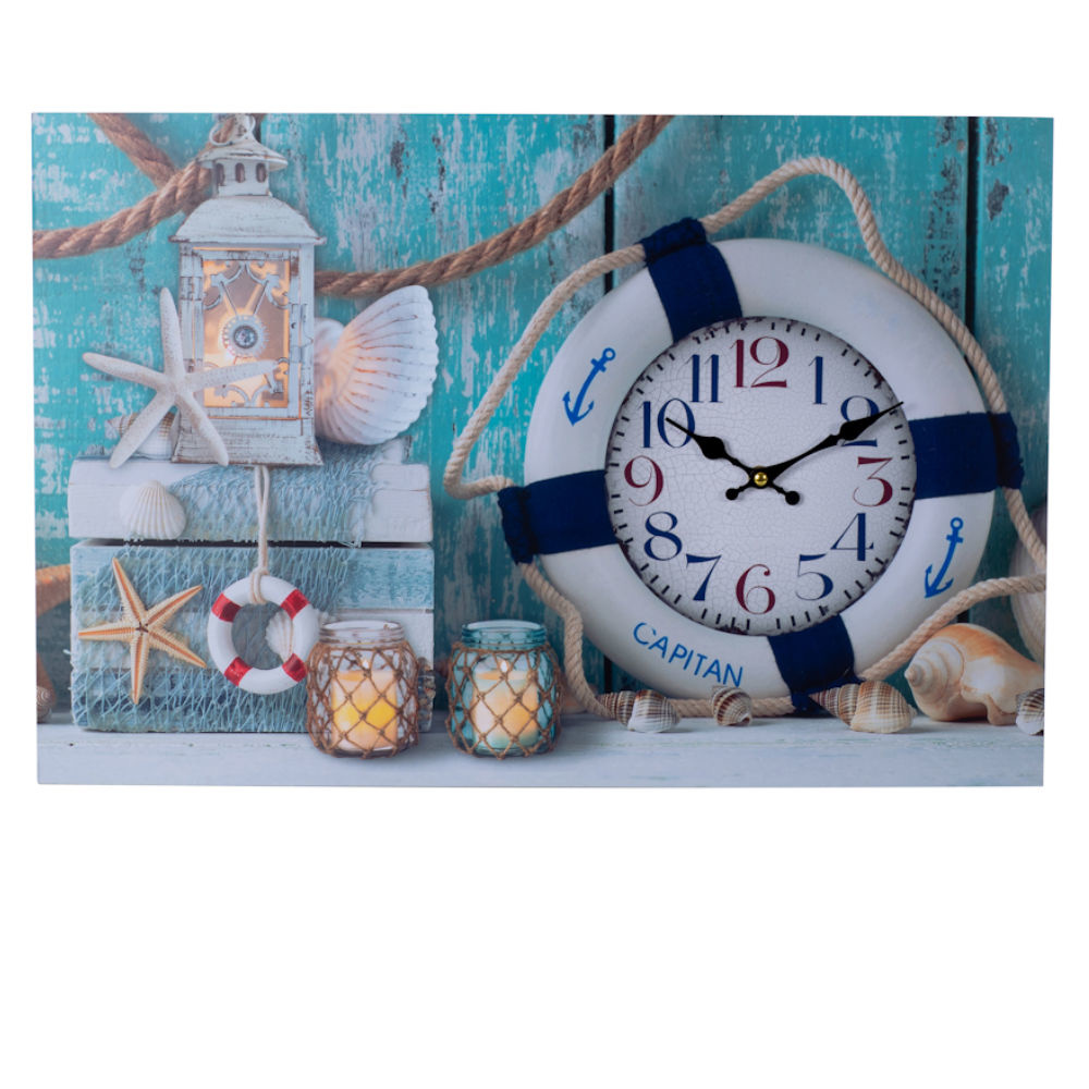 Decopatent XL Canvas Schilderij Wandklok ZEEZICHT ZEEBOEI & SCHELPEN met Klok - Wand Klok Landelijk / Brocante - Canvasklok - Canvas Wandklokken met Klok - Keukenklok - Muurklok Wand Klok - Afm. 60 x 40 Cm - Decopatent®