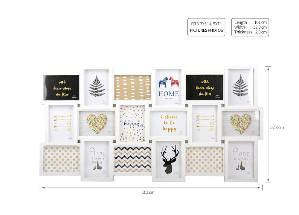 In deze collagelijst plaats je 18 van je meest dierbare foto's. Bijvoorbeeld van je familie, vakanties of je huisdieren. Hang de lijst vervolgens op een mooie plekje aan de muur en je wordt vaak herinnerd aan de mooie dingen in je leven!