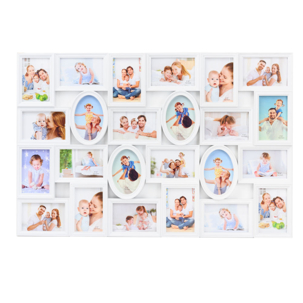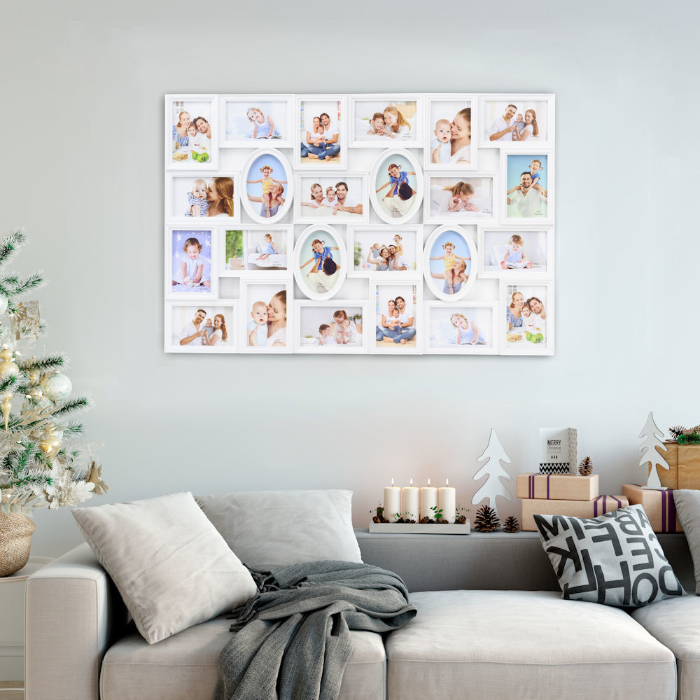 Alle foto‘s van die geweldige momenten welke je met je familie, vrienden of op vakantie hebt meegemaakt slingeren nu nog vaak rond in je la of op de harde schijf van je computer of telefoon? Deel met deze grote fotolijst deze prachtige foto's met de nieuwsgierige kijkers! Creëer zelf een persoonlijke fotocollage met behulp van deze uiterst decoratieve fotolijst. Hij biedt ruimte voor in totaal 24 foto‘s. Dankzij de ophang haken aan de achterkant kan je zelf bepalen of hij verticaal of horizontaal wordt opgehangen.