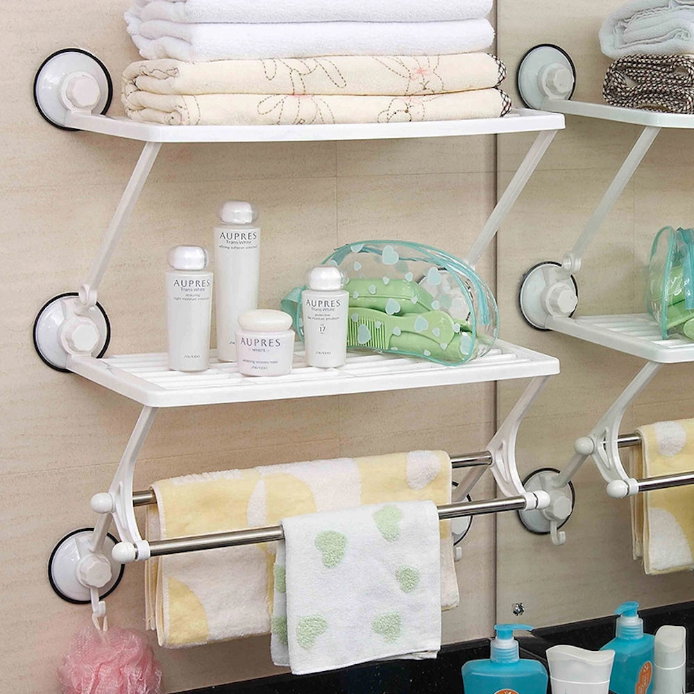Decopatent Zelfklevend Badkamer / Keuken Opbergrek met 2 Legplanken en 2 Handdoek stangen - Muur / Wand Bevestiging met Zuignappen - Handdoekhouder Badkamer - Wand Handdoeken rek Stang Houder - Handdoek rek Handkoekstang - Zonder Boren & Schroeven - Decopatent®